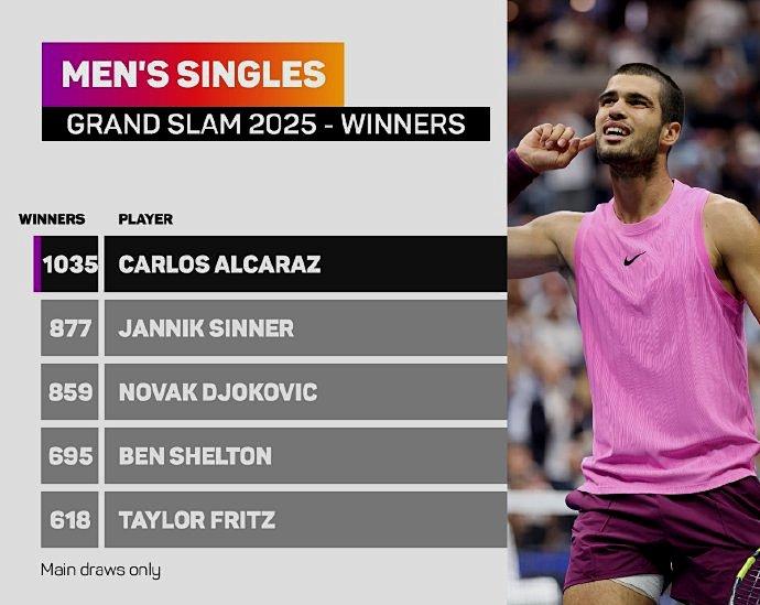 我们首先来关注一项最新的数据排行榜。在美网精彩落幕之后,本赛季的四项大满贯赛事也全都结束。那么,在今年的大满贯赛场上,谁是打出制胜分最多的那个人呢?其实,答案只能在世界排名TOP2的辛纳和阿尔卡拉斯两人之间产生。排名第一的不是四大满贯都闯进决赛拿到两冠两亚的意大利人辛纳,而是获得法网和美网冠军的西班牙小伙子阿尔卡拉斯。