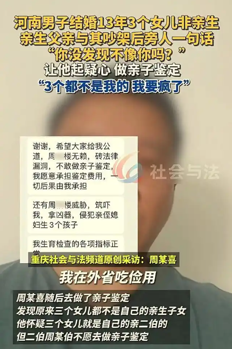 在河南的某个宁静村庄,一场家庭伦理风暴正席卷而来,令所有人瞠目结舌。建筑工人周先生,一位为家庭默默奉献的顶梁柱,近日将前妻告上法庭,只为讨回那 15 万元的抚养费。而这背后的缘由,犹如一颗重磅炸弹,炸碎了无数人的三观,他含辛茹苦养育 13 年的三个女儿,竟没有一个是自己亲生的,更令人震惊的是,孩子的生父,竟是他的亲二伯!