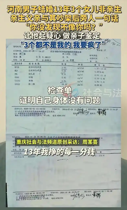 等待鉴定结果的日子,对周先生来说,无疑是一种煎熬。每一分每一秒,都像是在受刑,夜晚躺在床上,他辗转反侧,脑海里全是各种可怕的猜测。终于,鉴定报告出来了,当周先生看到报告上那一行行清晰的字,“与三个女儿均无血缘关系” 时,他感觉整个世界都在瞬间崩塌。那一刻,他呆立在原地,久久无法动弹,仿佛灵魂都已被抽离。